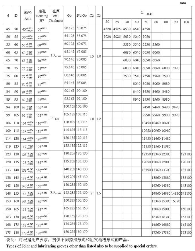 JF 雙金屬產品系列軸承標準尺寸