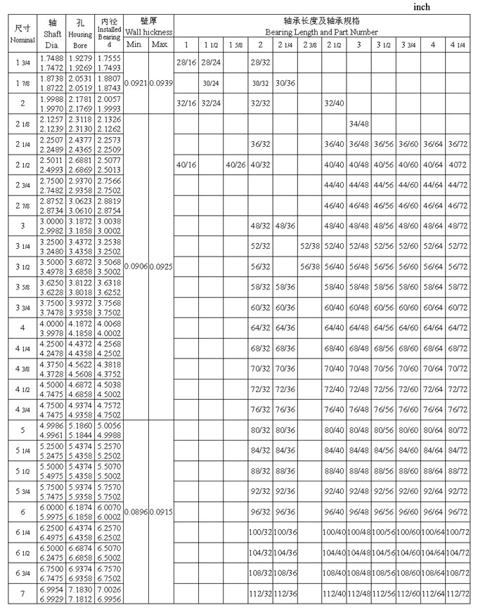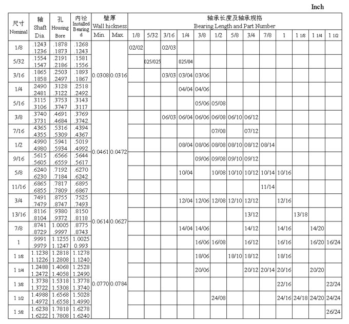 JS1 系列軸承英制尺寸