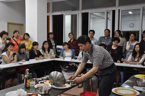 從2014年4月21日起,每逢周一晚上,公司幾十名廚藝愛好者都會(huì)興致勃勃地聚集在漳州市總工會(huì)職工業(yè)余學(xué)校,一起認(rèn)認(rèn)真真地學(xué)習(xí)廚藝,捧著筆記本仔細(xì)記下授課老師講解的做菜要點(diǎn),睜大眼睛盯著授課老師的現(xiàn)場(chǎng)操作,從烹飪的基礎(chǔ)知識(shí)、刀功的基本要領(lǐng)、配菜的基本方法到一道道葷素搭配、家常可見的美味佳肴如芝麻雞、排糖醋肉、紅燒魚塊、椒鹽海蠣、松仁玉米、沙司茄子等,都生怕落下一個(gè)小小的細(xì)節(jié)……