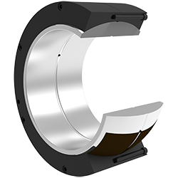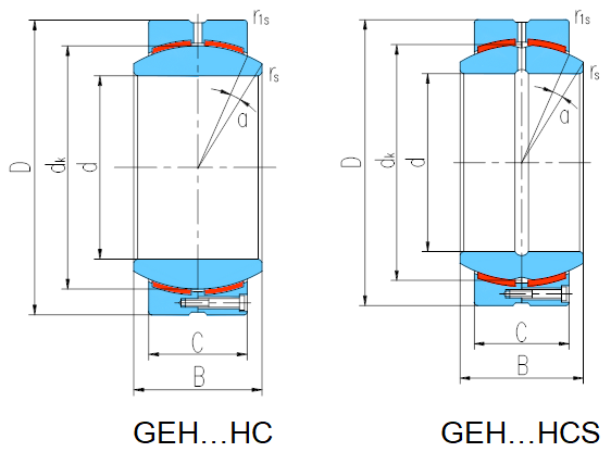 產品特點:外圈徑向分為兩半,用螺釘鎖緊,材料為碳鋼,磷化,球面襯有PTFE復合材料;內圈材料為軸承鋼,淬火,球面鍍硬鉻,型號后置代號加S,表示內圈有潤滑油槽油孔。
