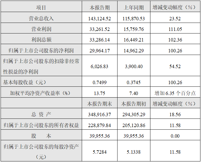 (3)報告期受益于公司主營業(yè)務增長、非經(jīng)常性損益大幅增加,公司全年利潤總額預計33,286.14萬元,同比增長102.36%;歸屬于上市公司股東的凈利潤預計29,964.17萬元,同比增長100.26%。