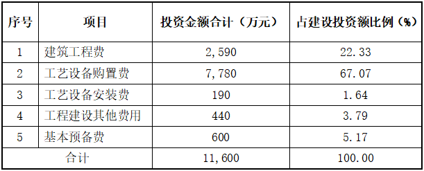 項目總投資15,500萬元,其中:建筑工程費2,590萬元,工藝設備購置費7,780萬元,工藝設備安裝費190萬元,工程建設其他費用440萬元,基本預備費600萬元,鋪底流動資金3,900萬元。
