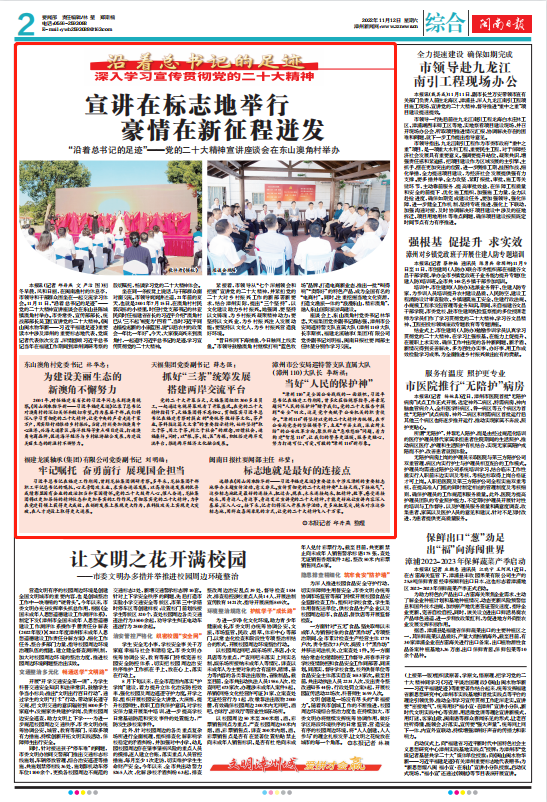 本報訊(記者 邱丹燕 文 嚴(yán)潔 圖)初冬早晨,風(fēng)和日麗,在閩南漁村的休息亭,市領(lǐng)導(dǎo)和干部群眾圍坐在一起交流學(xué)習(xí)體會。11月11日,“沿著總書記的足跡”——黨的二十大精神宣講座談會在東山縣陳城鎮(zhèn)澳角村舉辦。市委常委、宣傳部部長、統(tǒng)戰(zhàn)部部長吳衛(wèi)紅宣講黨的二十大精神。《閩山閩水物華新——習(xí)近平福建足跡》重要讀本中涉及漳州的重要標(biāo)志地代表、黨媒記者代表依次發(fā)言,深情回顧習(xí)近平總書記當(dāng)年在福建工作期間到漳州調(diào)研考察的殷切囑托,暢談學(xué)習(xí)黨的二十大精神體會。