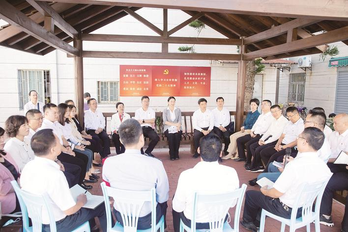 坐在同一條板凳上說話,與干部群眾面對面交流。市領(lǐng)導(dǎo)娓娓講述道,21年前的夏天,也就是2001年7月15日,在澳角村村民郭漢棟的小樓里,時任村黨支部書記的林亞民向時任福建省省長的習(xí)近平介紹“澳角村已從‘三不起’蛻變?yōu)椤目础保?dāng)時習(xí)近平同志描繪起新的小康藍(lán)圖,說“以后農(nóng)村的政策會一年比一年好”。今天,大家很高興來到澳角村,一起追尋習(xí)近平總書記的足跡,學(xué)習(xí)宣傳貫徹黨的二十大精神。