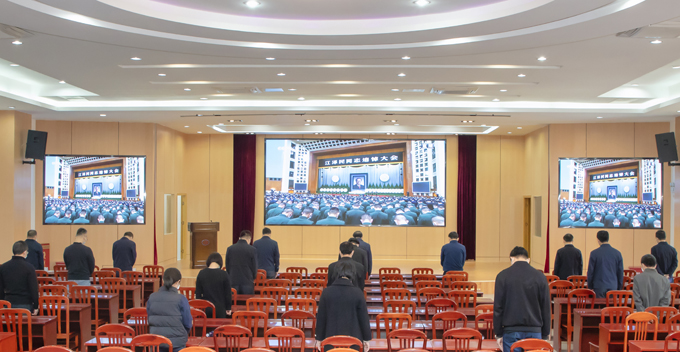 收聽收看過程中,大家悲痛肅立,在悲壯的哀樂聲中默哀三分鐘,認(rèn)真聆聽習(xí)近平總書記所致悼詞,追憶江澤民同志光輝的一生和建立的豐功偉績,深刻感悟江澤民同志的精神風(fēng)范。