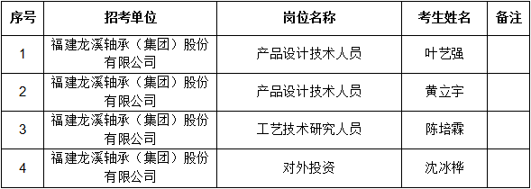 根據(jù)《福建龍溪軸承(集團(tuán))股份有限公司2022年公開招聘方案》有關(guān)規(guī)定,經(jīng)面試等程序,現(xiàn)將公司擬聘用人員予以公示,公示期為5個工作日,公示名單如下: