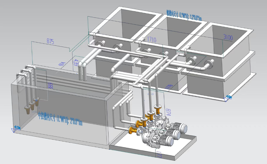 (2)每只主槽配兩路鈦制溢流管道,管與槽子焊接,槽液溢流進(jìn)入中控槽液面以下100mm,并應(yīng)有防虹吸措施;底閥入中控槽離槽底距離50mm;管道平面圖和立面圖附后,圖中管道尺寸按槽子相對(duì)位置作的基本設(shè)計(jì),可在此基礎(chǔ)上進(jìn)一步優(yōu)化管道設(shè)計(jì),實(shí)施中應(yīng)根據(jù)實(shí)際測量與安裝情況作出調(diào)整材料用量。