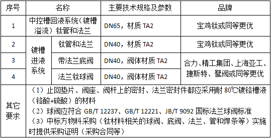 自動(dòng)鍍鉻生產(chǎn)線現(xiàn)有鍍槽-中控槽鍍液循環(huán)系統(tǒng)塑料材質(zhì)管道(管道、接頭與閥體)使用到一定年限老化,其中的溢流管路、回液管路及閥件將更新為鈦材料。