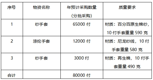 (三)項目內容:福建龍溪軸承(集團)股份有限公司計劃采購紗手套、滌綸手套年約80000付。
